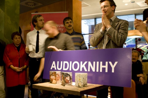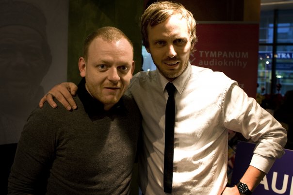 Ľuboš Kostelný a Michal Hvorecký na krste troch nových slovenských audiokníh.