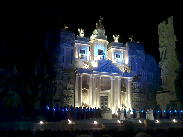 Leto znamená pre operného priaznivca ťažké abstinenčné obdobie. Za cynických 67 Eur som si kúpil jeden z najlacnejších lístkov a vybavený zimným oblečením podstatne lepšie ako na Pohodu som zamieril do Burgenlandu. Opera sa hrá v impozantnom bývalom rímskom kameňolome pod holým nebom, plnom sladkých výparov dozrievajúcich viníc a kyslastého pachu inkontinenčných pomôcok. Keďže som bol v obrovskom hľadisku jediný divák mladší ako osemdesiat rokov, osadenstvo sa ku mne správalo so zmesou podozrievavosti a úcty.