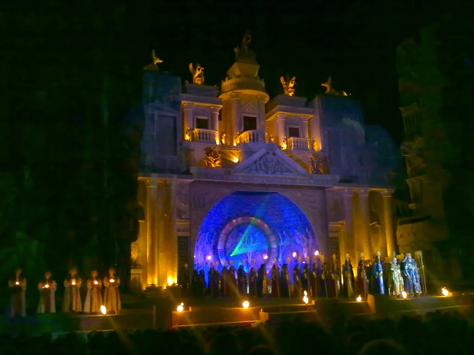 Wenn sich das vordere Bühnendekor öffnet – es sind riesige, von Wurzeln umschlungene Löwenköpfe – wird das wohl jedem Jordanienreisenden bekannte sogenannte “Schatzhaus des Pharao”, das Khazne al-Firaun, der wohl berühmteste Grabtempel in Petra, sichtbar. Fast detailgerecht nachgebaut und – mit futuristisch-magischem, rauchschwadigem und laserbestücktem Innenleben ausgestattet – ist diese artifizielle Kopie eines Ansichtskartenthemas auch der Schauplatz der sehenswerten Feuer- und Wasserprobe. Bei letzterer hätte man gerne mitgemacht, denn die Temperaturen im Steinbruch waren an diesem Abend jenen von Jordanien nicht unähnlich. Und mit entsprechender Beleuchtung wandelte sich das Bild von einer glanzvollen Tempelfassade bis hin zur steinerstarrten Landschaft des enormen Bühnenrunds. Eine auch in dieser Saison höchst beachtenswerte, wenn nicht gar die bisher beste Leistung von Helmut WABA, der auch für die Regie verantwortlich zeichnet, aber dabei über solides und konventionelles Arrangement nicht viel hinauskam. Gut, da steht ein Double der sternflammenden Königin in 22 Metern Höhe und bewegt auch noch exakt alles, was es beim Singen zu bewegen gilt, da flattern gezähmte Tauben nach einigen Ehrenrunden in den Käfig Papagenos, da gleicht der Priesteraufmarsch im letzten Bild schon einem größeren Reichsparteitag der Freimaurer, da schweben die drei Knaben im Schiffchen vom Felsen herab. Ansonsten läuft das Wesentliche fast immer in der Bühnenmitte, garniert mit szenischen Leerläufen ab, man vermisst die Möglichkeiten an Bewegung, an Schweben und Versenken, wie es das Barocktheater gekannt hatte und dem Bühnenbild angemessen gewesen wäre. Warum verschenkte die Regie etwa die Schlangenszene durch eine an den Bühnenrand verlegte Harmlosigkeit?