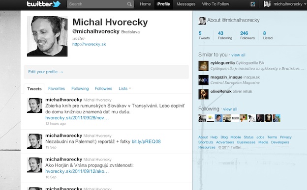 Twitter 02/10/201102/10/2011 / Michal Hvorecky Aktivoval som profil na Twitteri, pozrite sa a v prípade záujmu nasledujte tu. Zdieľaj tento článok: Kliknite pre zdieľanie na Facebooku(Otvorí sa v novom okne) Facebook Kliknite pre poslanie článku e-mailom priateľovi(Otvorí sa v novom okne) E-mail Click to share on X(Otvorí sa v novom okne) X Kliknite pre tlač(Otvorí sa v novom okne) Tlačiť Páči sa mi Nahráva sa...