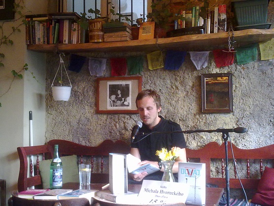 “Úplne otvorene priznávam a nech do mňa najbližšie na ulici ktokoľvek za to hodí kameňom, ak to uzná za vhodné, nebudem sa brániť. Nepoznal som Michala Hvoreckého, vôbec som o ňom nič netušil, akurát som vedel, že je to mladý muž z Bratislavy a poslednú dobu sa o ňom hovorilo snáď všade a hlavne veľa. Nebolo ma teda treba dlho presviedčať; keď som sa dozvedel, že sa v meste koná čítačka k príležitosti jeho novej knihy, nahodil som kamenný výraz, založil slnečné okuliare a vybral sa napraviť dve skutočnosti – spoznať p. Hvoreckého a zúčastniť sa mojej prvej čítačky nejakého známeho autora.”